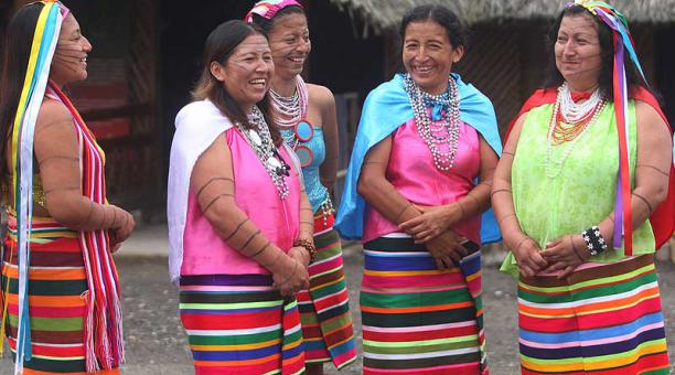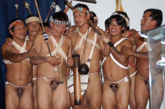 Vestimenta tradicional. Los Huaoranis conservan su aislamiento y viven desnudos, las mujeres usan una prenda en la cintura hecha de la corteza de un árbol y el hombre usa un cordón con el cual se amarra su órgano sexual, práctica muy cómoda para moverse en su hábitat.